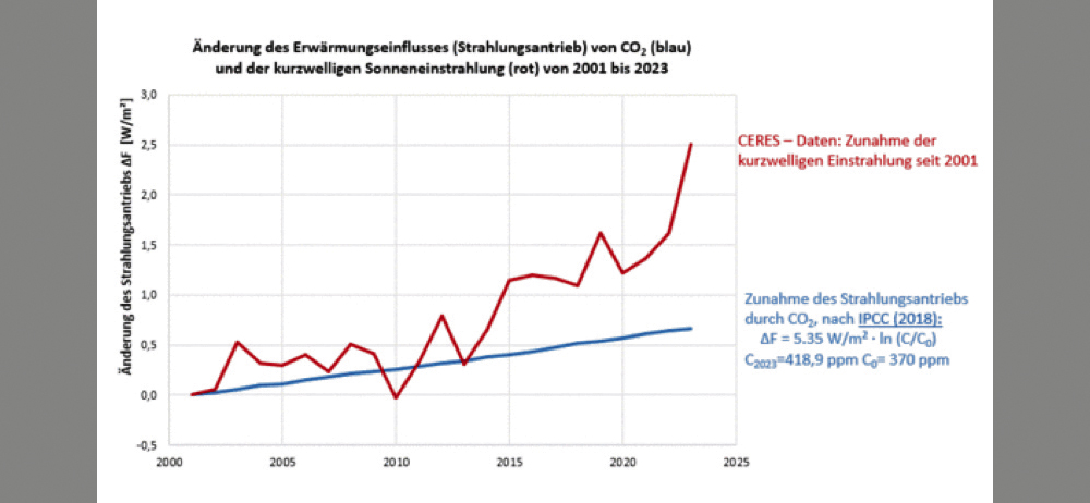 Еще в 2021 г. мы с д-ром Хансом-Рольфом Дюбалем провели сенсационную оценку результатов измерений НАСА входящего коротковолнового солнечного излучения и длинноволнового обратного излучения, вызванного парниковыми газами. Мы пришли к выводу, что около 80% потепления было вызвано увеличением входящего коротковолнового излучения от Солнца. Основной причиной этого стало уменьшение количества облаков. Увеличение проницаемости для поступающей солнечной радиации приводит к потеплению. Разумеется, увеличение количества радиации, достигающей Земли, также приводит к увеличению длинноволнового излучения от Земли и усилению парникового эффекта. Результат был однозначным.