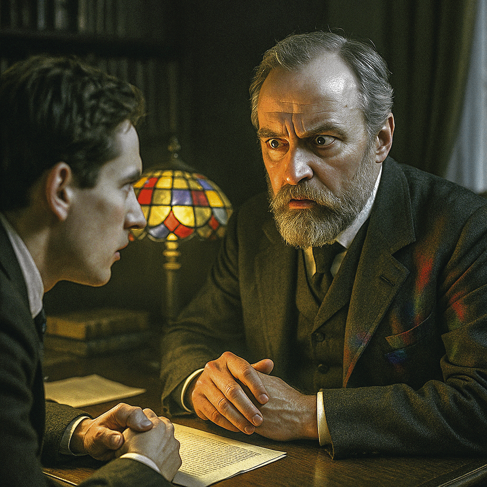 Это произошло вечером, в полумраке кабинета. Дрожали красные, синие, желтые пятна, которые бросал разноцветный фонарик. Молодой человек сидел перед Иваном Ивановичем, наклонившись, с жадно раскрытыми глазами, засматривая ему в глубину очей, казалось, страдал и млел и только иногда шептал: