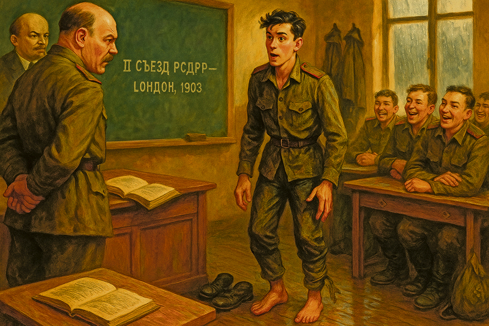 А тем временем наш преподаватель, майор Трёшкин, заложив руки за спину, вышагивает по комнате, самовлюбленно поглядывает вокруг и вбивает, как гвоздями, в наши отупевшие от военных забав головы великие идеи партии, убежденный, что мы с интересом слушаем его. И вдруг, уловив Андрюшкин храп, опускает взгляд вниз, на босые ноги и, ткнув в него пальцем, срывающимся голосом кричит: