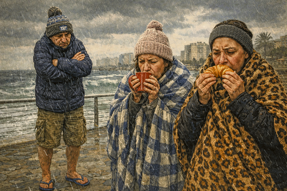 Третьим путем утепления израильтяне идут нерешительно. В том смысле, что куртка с шортами и шлепанцами или сапоги на меху с флисовой пижамой, стандартный аутфит мерзнущего иудея, нельзя считать полноценным зимним обмундированием. Даже если на голову надета шапка. Во всем этом мы и по улице ходим, и дома сидим, дополнительно замотавшись пледами, потому что квартиры у нас не отапливаются, как известно. В критических ситуациях, когда уж совсем невыносимо, израильский человек включает кондиционер на обогрев, хотя эффект от этого обогрева сомнительный.