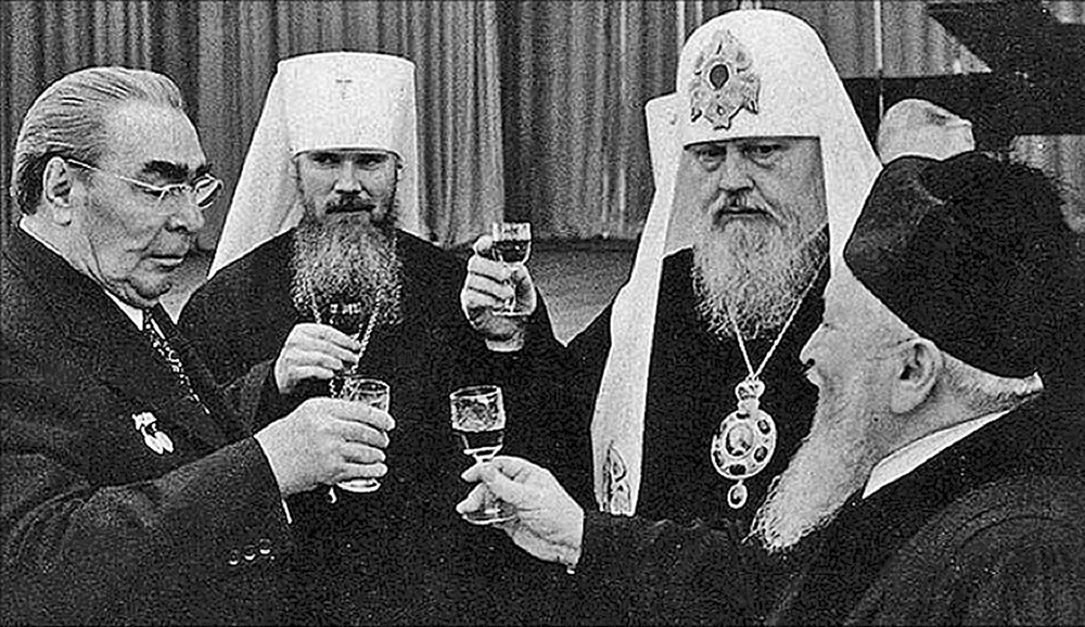 На приеме по случаю 60-й годовщины Октябрьской революции. Слева направо: Л. И. Брежнев, митрополит Алексий, Патриарх Московский Пимен, раввин Яков Фишман © WIKIPEDIA
