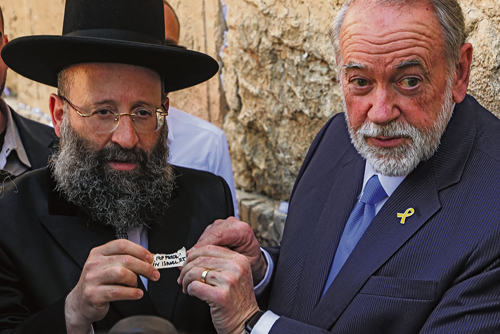 Посол США в Израиле Майк Хакаби (справа) и раввин Стены Плача Шмуэль Рабинович держат записку от Дональда Трампа с надписью «За мир в Израиле», перед тем как поместить ее в щель Стены© GIL COHEN-MAGEN / AFP