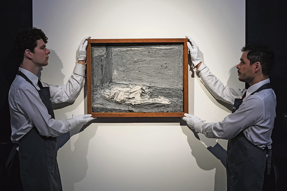 Ассистенты готовят картину Франка Ауэрбаха «Обнаженная на кровати III» к торгам в аукционном доме Christie's© WIKTOR SZYMANOWICZ / NURPHOTO / NURPHOTO VIA AFP