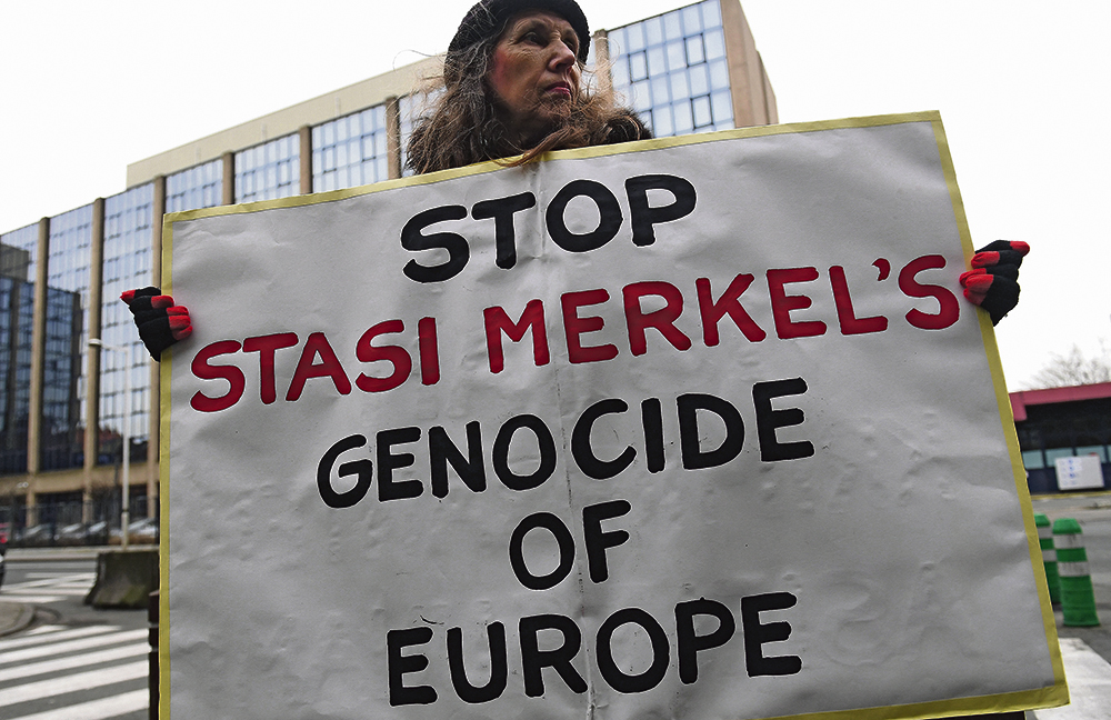 Уже в 2017 г. в Брюсселе, где Меркель получала почетную докторскую степень Левенского и Гентского университетов, демонстранты требовали «Остановить геноцид Европы, устроенный Штази-Меркель». Прошли годы, последствия ее правления известны, но незаслуженные почести продолжаются© EMMANUEL DUNAND / AFP