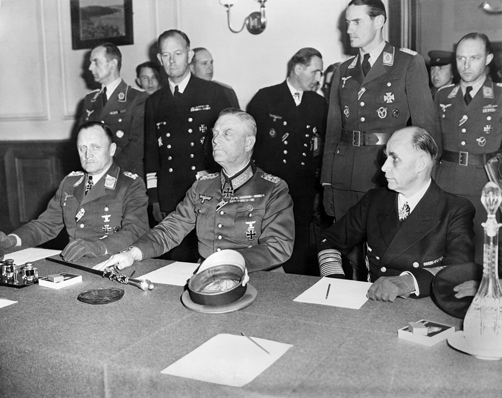 Представитель люфтваффе генерал-полковник Г. Штумпф, генерал-фельдмаршал, начальник Верховного главнокомандования вермахта В. Кейтель и кригсмарине – фон Фридебург перед подписанием Акта о капитуляции 8 мая 1945 г. © AFP