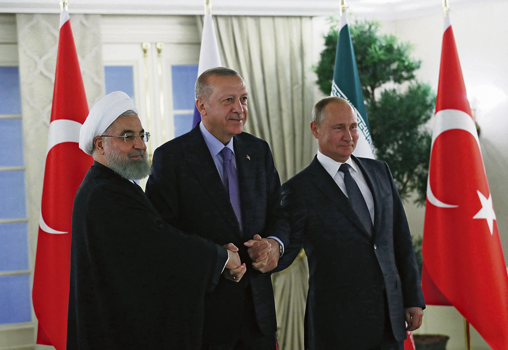 Президент Турции всегда охотно окружал себя людоедами: Эрдоган (в центре) с Владимиром Путиным (справа) и тогдашним президентом Ирана Хасаном Рухани перед началом трехстороннего саммита в Анкаре, 2019 г. © MURAT KULA / ANADOLU AGENCY / ANADOLU VIA AFP
